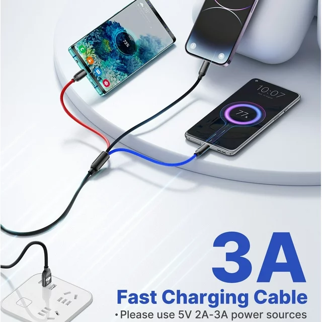 This multi charging cable with 3 different USB ports, including Micro USB, USB-C, and iP connectors. Support to charger most of the mobile phones available on market. 4 ft is the perfect length for a charging cable for various applications, 3-in-1 design, support 5 Vlots 3 A fast charging, makes the cord portable and only need one cable when you are on a business trip or traveling.