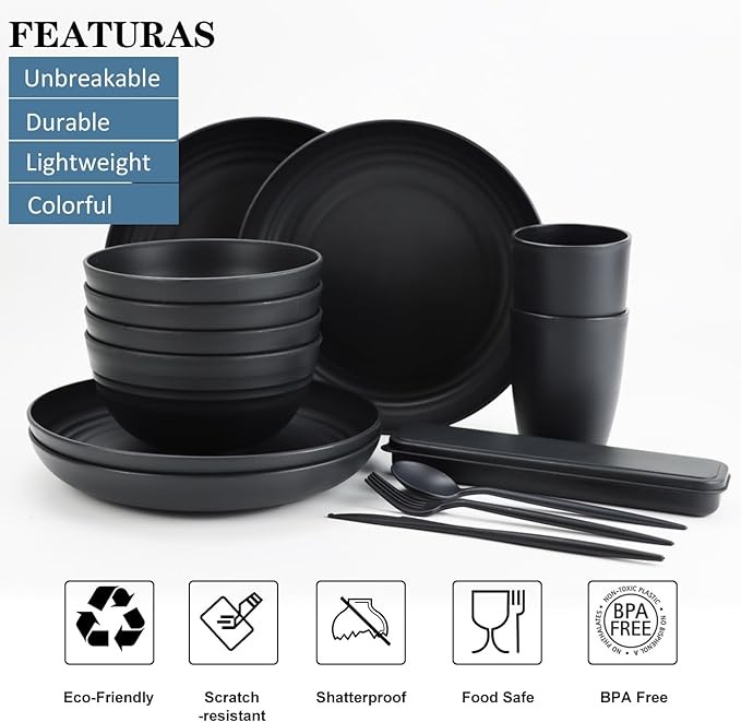 • ?[???? & ?????????] Our lightweight and unbreakable dish set for 4 is designed to be shatterproof and anti-slip, providing an extra layer of safety for families with kids and seniors. Featuring unique anti-slip patterns, our cups, plates, and bowls are both beautiful and practical for indoor and outdoor use. Plus, our wheat straw dinnerware set comes with cutlery and portable boxes for added convenience at work or camping.