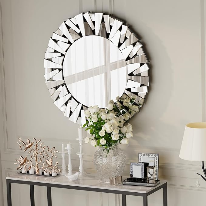 Art Deco Style Round Glass Mirror - 32 inch Silver wall mirror can reflect enough natural light. Simple and modern design elements make it easy to integrate into various scenes, such as living room, dining room, bathroom or corridor. The mirror has an art deco style that can add some glamour and sophistication to your room