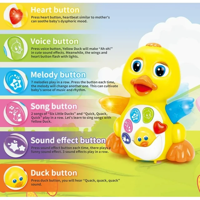PLAYS FUN MUSIC: So many different songs come out from this duck, your baby’s auditory senses will develop quickly and healthily – music teaches your child about rhythm and animal sounds.