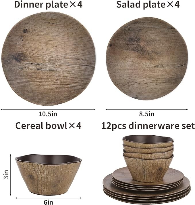 SERVICE FOR 4: Complete 12 piece melamine dinner set for 4; 4 pcs large 10.5" dinner plates, 4 pcs 8.5" salad or dessert plates, & 4pcs 6" wide x 3" high soup/cereal bowls. Consider complimenting our rustic melamine plastic plates and bowls set dishes with our polished hand-forged flatware. A beautiful addition to your rustic farmhouse kitchen decor and home decor.