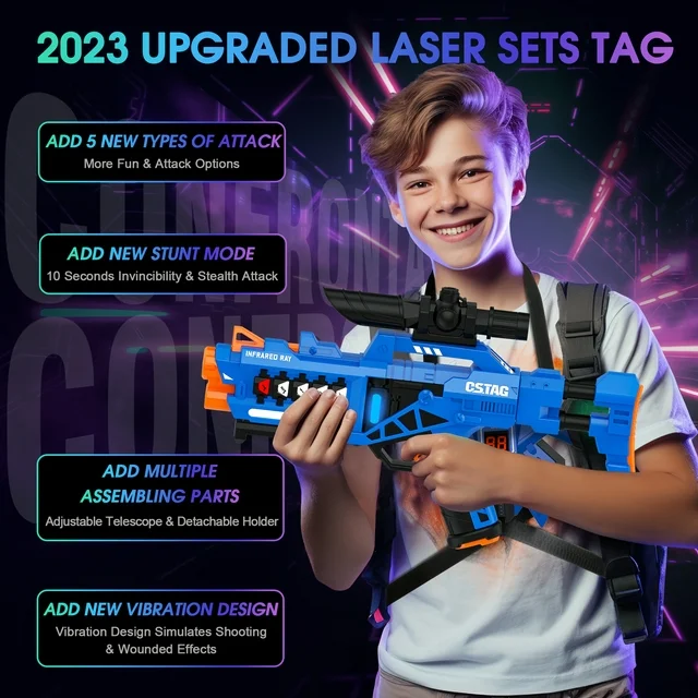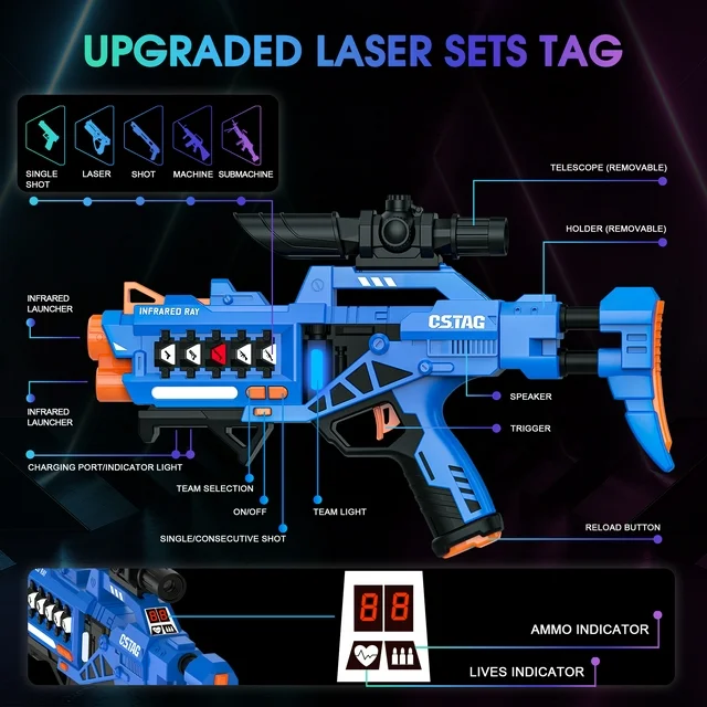 ARCADE STYLE LAZER TAG GAME:Turn your home or backyard into a laser tag arena with the laser tag blaster set,this fully interactive set designed with infrared receivers and light emitters that are fun and reduce the chance of injury.