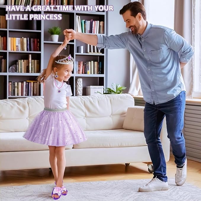 Princess Dress Up Play Shoes: The elastic waistband princess skirt has a polyester lining and an outer layer of tulle which is covered by snowflakes, stars, moon patterned glitters. 3 pairs of wide non-slip princess dress-up shoes for girls features bowknot decor in different colors. It is fixed on the shoe by sewing, compared to sticking, making it more secure and comfortable