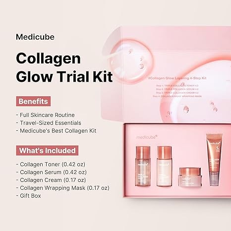 ?Medicube's best-selling collagen glow skincare essentials? are formulated with triple collagen for plumping and glowing skin. Try our trial skincare routine featuring four different mini-sized products: Collagen Toner, Serum, Cream, and Night Wrapping Mask.