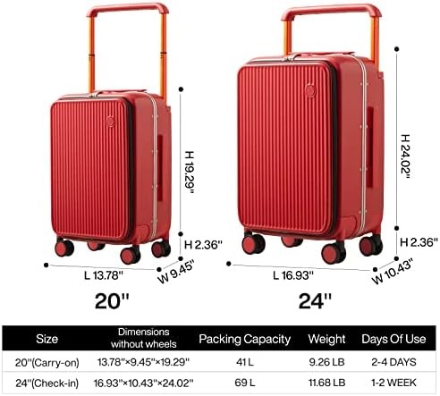Mixi Carry On Luggage 20'' Suitcase with Front Laptop Pocket, Wide Handle Rolling Travel Suitcases PC Hardshell with Aluminum Frame Spinner Wheels & TSA Lock, Carry-On Luggage(Red)