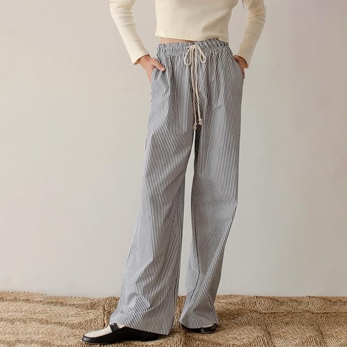 Spring fall pop pants bottoms for women, elastic high waist and drawstring, with two side pockets, wide leg straight long pants, striped linen pants, blue and white striped pants, casual striped wide leg pants, pj pants y2k, loose stripe long pants.
